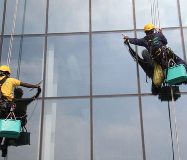 Façades en verre : Nettoyage de baies vitrées et vitrines en hauteur (avec nacelle ou cordistes certifiés) pour un rendu transparent sans trace.